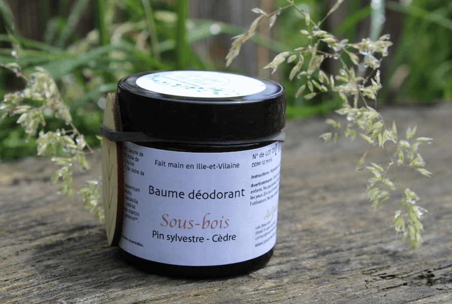 Sous-bois est un baume déodorant contenant des huiles essentielles de pin sylvestre, de cèdre de l'atlas et de palmarosa.